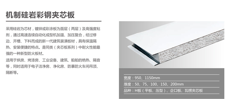 采用硅巖為芯材,鍍鋅或彩涂板為面層(兩層)及高強度粘劑,通過高速連續(xù)自動化成型機加溫、加壓復合,經過修邊、開槽、下料而成的新一代建筑裝潢板材,具有保溫隔熱、安裝便捷的特點。是同類(夾芯板系列)中耐火性能最強的一種新型防火板材。