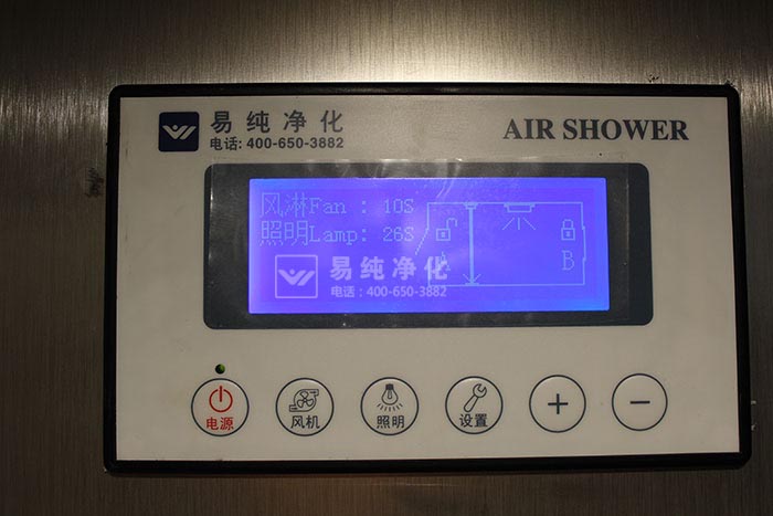 (七)風(fēng)淋控制面板為液晶藍(lán)屏顯示,且?guī)в衅聊槐Wo(hù),易純凈化出廠的風(fēng)淋室控制面板解鎖辦法只需要連續(xù)按“—,+,照明"三鍵,聽見”滴滴"兩聲后,可進(jìn)行風(fēng)淋時(shí)間,照明時(shí)間,屏保時(shí)間設(shè)置即可。