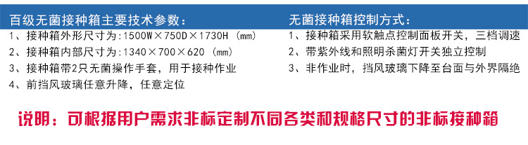 無(wú)菌接種箱為百級(jí)環(huán)境,內(nèi)部帶有紫外線殺菌燈,在將接種種苗或菌包放入接箱內(nèi)后,內(nèi)部進(jìn)行密閉殺菌,在接種過(guò)程中全程密閉,人員通過(guò)無(wú)菌手套箱進(jìn)行操作,手套箱為無(wú)菌室專用,有極強(qiáng)的耐酸耐堿性。百級(jí)無(wú)菌接箱可極大的提高接種的成活率,效率達(dá)到99%以上。