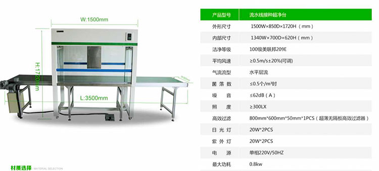 一半以上的客戶選擇食用菌專用流水線接種超凈工作臺,它有怎樣的優(yōu)勢呢?1、食用菌專用流水線接種超凈工作臺設(shè)備總長為:3500*620*1720,其中超凈工作臺的尺寸為:1500mm*800mm*1720mm,這樣設(shè)計的原因是為了更好的適用食用菌生產(chǎn)工藝的流程。2、食用菌專用流水線接種超凈工作臺采用軟觸點控制面板開關(guān),三擋調(diào)速。3、皮帶末端裝有光電感應(yīng),已接種好的菌種不易滑落至地面。4、設(shè)備內(nèi)有紫外線和照明燈,開關(guān)獨立控制。5、200W國產(chǎn)渦輪蝸桿電機,速比:1:10,變頻調(diào)速,速度2-6 m/min。6、單間輸送產(chǎn)品4KG/件。7、流水線采用電柜箱控制,分為腳踏按鈕和手動按鈕開關(guān)控制,設(shè)計更人性化。8、皮帶寬度530mm,厚度2mm,綠色防靜電皮帶,皮帶托輥采用304不銹鋼滾筒。