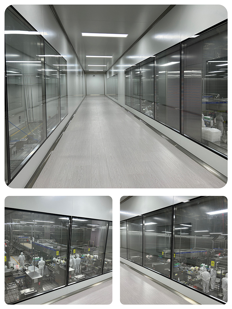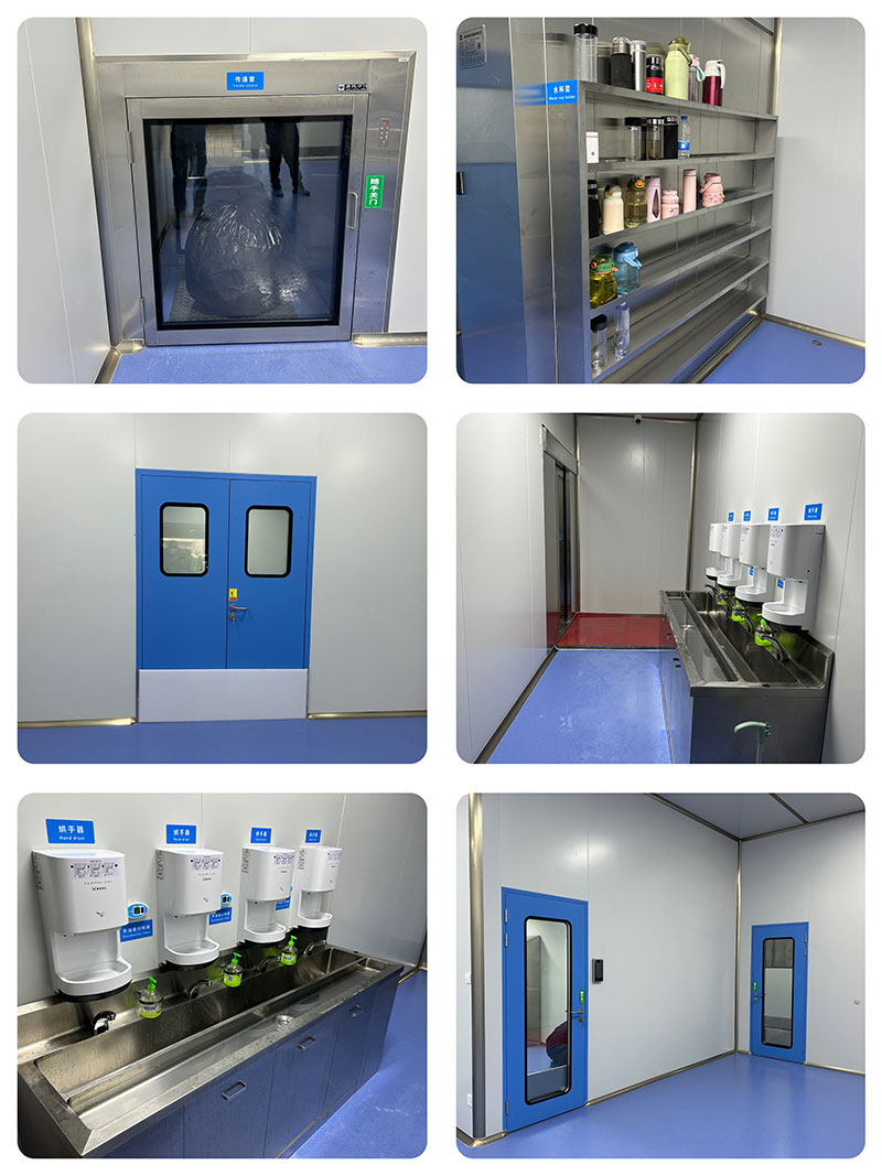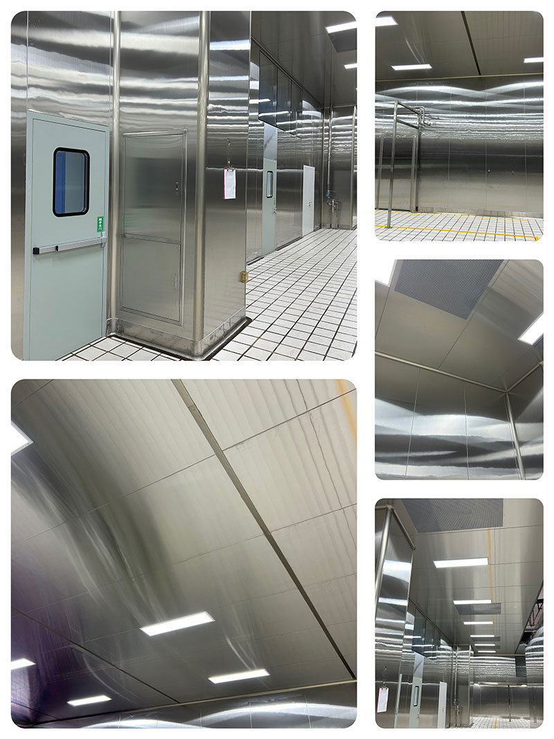 車間全部采用304不銹鋼板材安裝墻面和頂面,下部安裝有不銹鋼防水墻